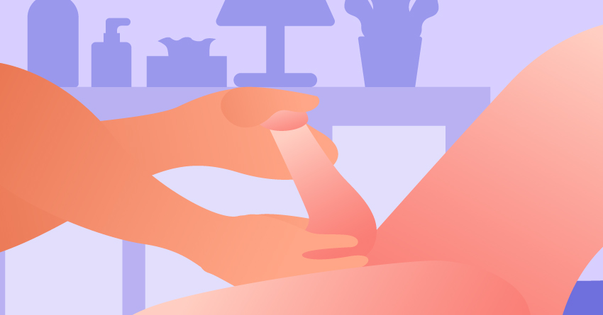 ابدأي بالإمساك بقضيبه ولف أصابعك حوله. يجب أن يكون خنصرك أقرب إلى خصيتيه بينما يكون سبابتك أقرب إلى رأس قضيبه.